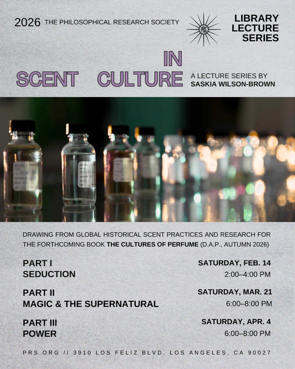 A smell-enlivened lecture series demonstrating perfumery's impact on creative and cultural expression, at Philosophical Research Society, Los Angeles.